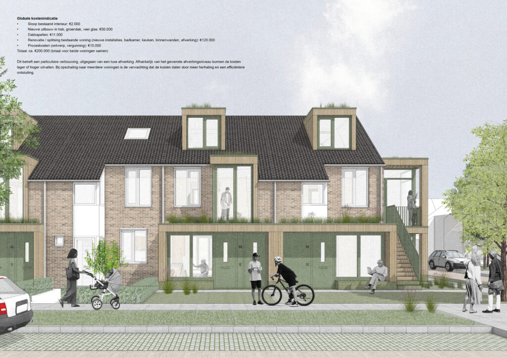 Het huidige vlakke en functionele gevelbeeld wordt verrijkt met grotere gevelopeningen. Een terugliggende entreenis met bankje stimuleert ontmoeting tussen bewoners en versterkt de relatie met de straat. Aan de achterzijde biedt een loggia in de uitbouw beschutting tegen hitte en extra privacy.