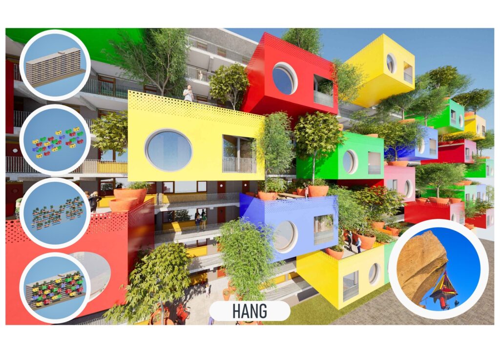 Lucht is gratis. De beste overruimte is een kuub lucht. Als de bestaande situatie geen maaiveld nodig heeft, is er ook geen sprake van kostbare grond. Ook het opofferen van een op zich goede woning ten bate van twee kleinere, is niet altijd nodig. Juist bij te verwachten grote renovaties van bestaande galerijflats, ligt een enorme kans om deze gratis lucht te benutten voor kleinschalige woonunits (30m2 GO, 60.000 euro). Hang staat voor hangen, niet blijven hangen, de hang naar beter. Het staat voor de hang die mensen aan het begin van hun volwassen leven of aan het einde daarvan hebben om zelfstandig te kunnen (blijven) wonen. Iedereen hangt op zijn eigen manier aan het leven, en wonen is daarin essentieel. Dan zou het fijn zijn om kleinschalig te kunnen wonen, met gebruik van bestaande (infra-)structuren. Bovendien kan de toegevoegde “openbare ruimte” worden gebruikt als daktuin. De galerij is niet meer alleen “van a naar b”. Er is ruimte voor vergroening, ontmoeting, en misschien wel gezelligheid. Dit vereist wel constructief denken. Letterlijk door toepassing van een lichtgebouwde uitkraging en versterking van de consoles. Figuurlijk door “out of the box” te denken: ook al zijn deze vrolijke, gladde doosjes net zo fijn en beschermend als al die andere woondozen in Nederland.