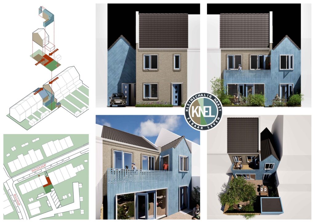 KNEL staat voor Kleinschalig Naast Elkaar Leven. Het benut de overruimte die op ons perceel tussen ons en de buren knellend aanwezig is. Tijdens de bouw in 2014 bleek al dat onze bescheiden eengezinswoning (twee lagen met kap, 100m2) op een relatief groot perceel staat (166m2). Een tussenhuis dus, knel tussen twee bouwblokken.