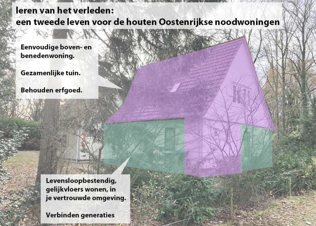 Mijn aandacht gaat hierbij specifiek uit naar de te benutten overruimte bij de Oostenrijkse houten noodwoningen. Deze zijn overal in Nederland terecht gekomen, ook in Brabant. In Eindhoven zijn veel van deze woningen nog in bezit van woningcorporatie Woonbedrijf. 75 jaar later worden veel woningen nog steeds met plezier bewoond, een tijdloos ontwerp dus. Het feit dat het om houtbouw gaat, maakt ze flexibel aanpasbaar en te verduurzamen.