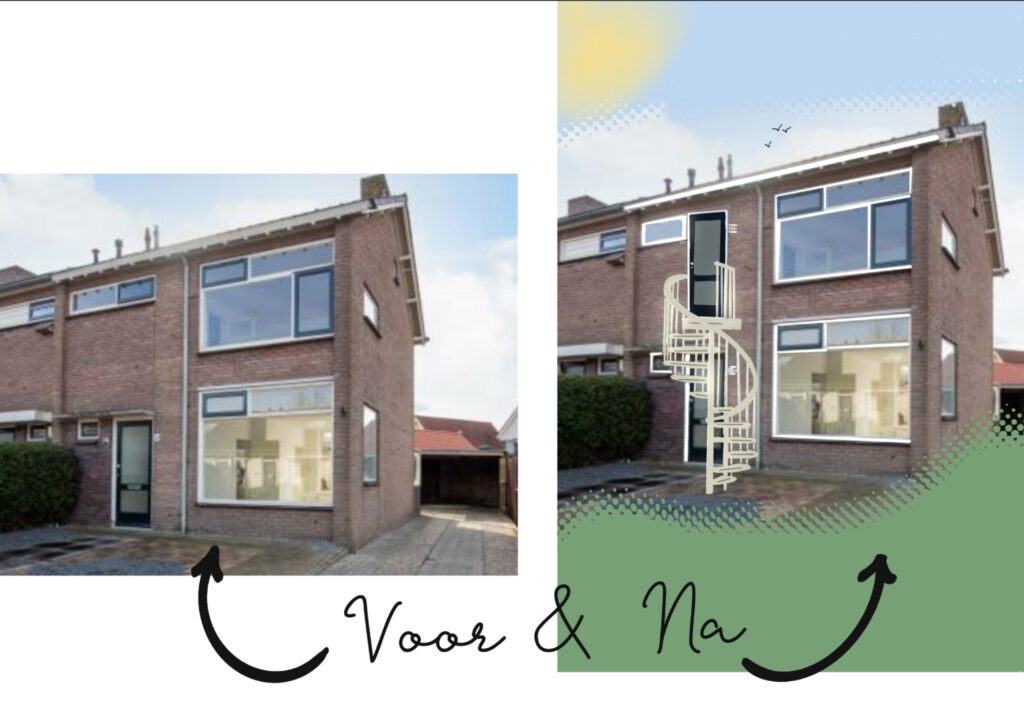 Met een wenteltrap via voorzijde naar de 1 etage, daar wordt een voordeur ingemaakt. Dus de eigenaar houdt de hoofdingang beneden, ieder een eigen entree. Ook de zolder biedt ruimte.