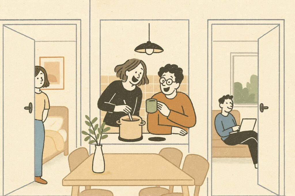 Each unit receives its own bedroom and living area, creating clear spatial boundaries and ensuring privacy. Shared service spaces remain centrally located, allowing efficient circulation and avoiding duplicated plumbing and ventilation. New openings and lightweight partitions are added only where essential to define entries and internal organization.