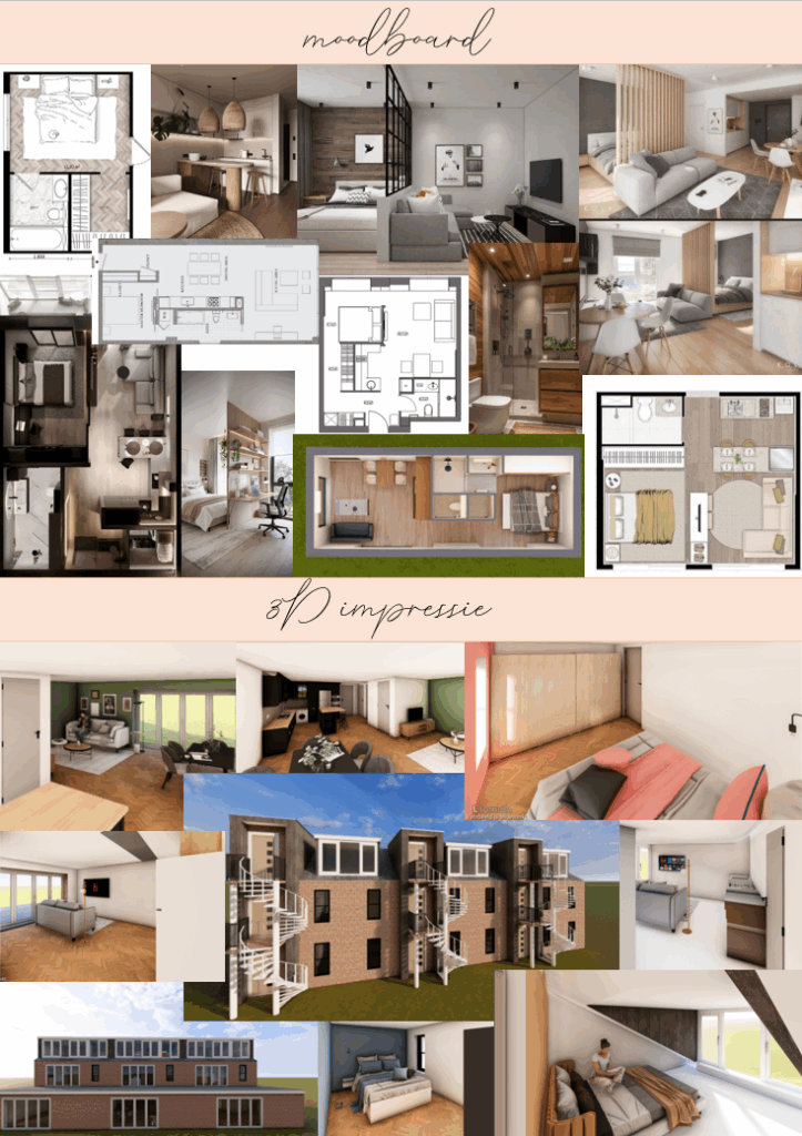 Wij hebben een woning in Hilversum uitgekozen uit 1936 met 157m2 woonoppervlakte. Dit huis hebben we opgedeeld in 3 woningen. Door de voorgevel wat aan te passen hebben we binnen meer ruimte. Door buiten een trap te plaatsen die naar de woningen gaan met een eigen voordeur besparen we binnen ook veel ruimte. De indeling op de begane grond en eerste verdieping zijn hetzelfde. Je komt binnen in de hal en daarna kan je via de deur in de hal naar de woonkamer en in woonkamer kan je via de deuren naar de wc, badkamer en slaapkamer. Op de begane grond heb je een eigen tuin en op de tweede verdieping heb je een balkon. Op de tweede verdieping hebben we het dak wat aangepast door dakkapellen te plaatsen voor meer ruimte en daglicht. In principe blijft de indeling hetzelfde als de andere woningen, maar is deze woning geschikt voor 1 persoon en de andere woningen voor 2 personen.