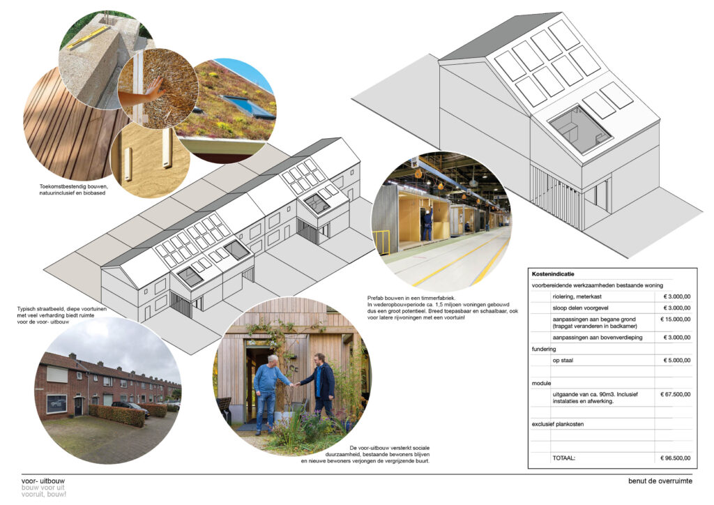 De voor-uitbouw richt zich op naoorlogse rijwoningen, veelal bewoond door babyboomers en vaak eigendom van woningcorporaties. Deze woningen hebben diepe voortuinen. Hierin plaatsen we de voor-uitbouw: een biobased prefab houten module geproduceerd in een timmerfabriek. Hierdoor wordt de woning op een duurzame, efficiƫnte en toekomstbestendige wijze opgesplitst in twee compacte woningen.