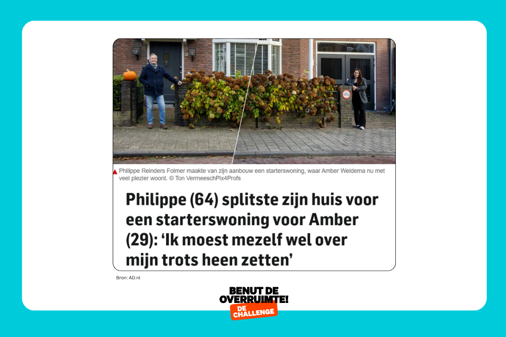 Het verhaal van Philippe verscheen in het AD naar aanleiding van de aandacht rond de Benut de overruimte! challenge. Het toont hoe persoonlijke motivatie en maatschappelijke impact samen kunnen komen. Philippe’s woning is niet alleen een fijn thuis voor hemzelf, maar ook een stap in de richting van toekomstbestendig wonen.